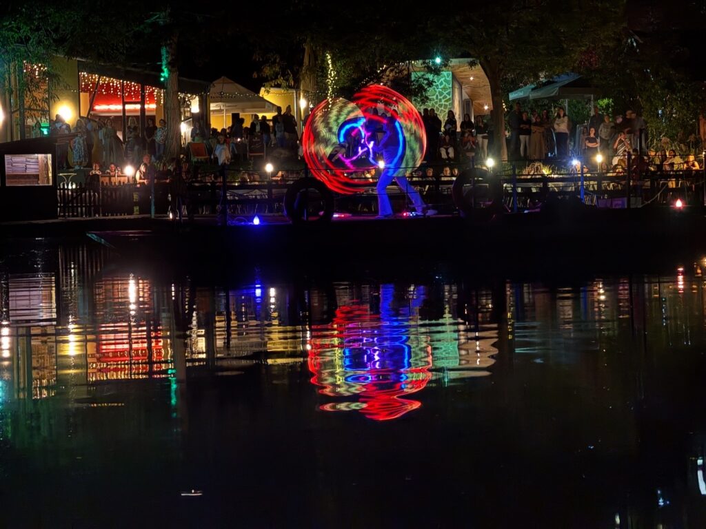 Ein weiteres unvergessliches Erlebnis war meine Solo-Performance auf einem Floß direkt auf der Donau. Mitten in der Nacht, umgeben vom dunklen Wasser, wirken die LED-Lichter und ihre Spiegelungen noch intensiver. Eine Lichtshow braucht scheinbar keine feste Bühne. Meine anfängliche Sorge um das Equipment direkt am Wasser hat sich schnell in Luft aufgelöst.